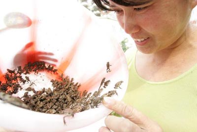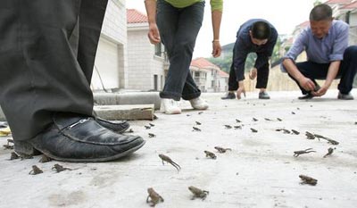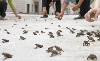 2006年4月27日,重慶南坪四秀小區(qū),人們好奇地在馬路上捉捉小蛤蟆玩耍。當(dāng)日,萬多只小蛤蟆爬上馬路呼吸新鮮空氣。