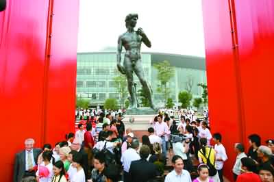 下午1時許,廣場上已經聚集了數(shù)百名市民代表,幾十家國內外媒體記者翹首以待,F(xiàn)場用了意大利國旗三色布置,不時可以聽到中國民歌和意大利歌劇。下午2時,大衛(wèi)雕像落成典禮正式開始。來自意大利的嘉賓和寧波市有關領導一起登臺。