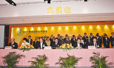 -“2007甬港經(jīng)濟(jì)合作論壇”在港舉行,寧波港集團(tuán)總裁李令紅(左四)與寧波市代表簽約。