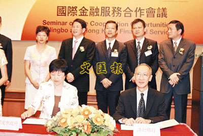 【本報(bào)訊】(記者卓建安、茅建興)“2007甬港經(jīng)濟(jì)合作論壇”重頭活動(dòng)之一國際金融服務(wù)合作會(huì)議昨日在港舉辦,寧波市副市長(zhǎng)蘇利冕、中國人民銀行寧波市中心支行行長(zhǎng)殷興山、匯豐銀行亞太區(qū)業(yè)務(wù)策略及經(jīng)濟(jì)顧問梁兆基等分別在會(huì)上介紹了寧波市經(jīng)濟(jì)發(fā)展情況、寧波市金融業(yè)的情況和香港金融業(yè)的發(fā)展概況,寧波市并與海外金融機(jī)構(gòu)簽訂了多項(xiàng)合作協(xié)議。