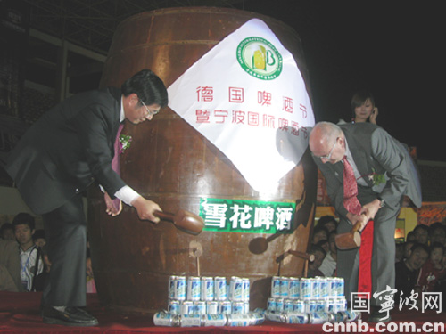 寧波市副市長(zhǎng)成岳沖先生和德國(guó)拉爾地區(qū)城市聯(lián)盟市長(zhǎng)瓦爾特·卡羅黎博士共同開(kāi)啟啤酒桶閥門(mén)