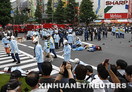 6月8日,警察和醫(yī)務(wù)人員在日本東京秋葉原電車站附近檢查。 新華社/路透