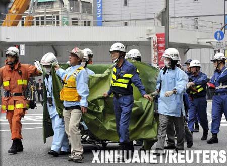 6月8日,在日本東京秋葉原電車站附近,救援人員將一名受傷者抬出襲擊現(xiàn)場。新華社/法新 新華社/路透(圖片來源:新華網(wǎng))
