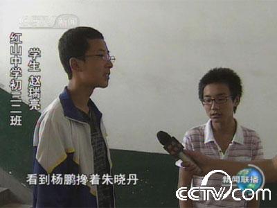 紅山中學(xué)初三二班學(xué)生張博:看到楊鵬攙著朱曉丹往下走著呢,也比較吃力一點(diǎn)。我在左面攙著,他(趙瑞亮)在右面攙著。