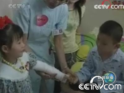 這個(gè)正在和小伙伴們開心唱著歌的小女孩就是王彬。天真、燦爛的笑容讓人們很難想象,她是一個(gè)剛剛失去右臂的殘疾孩子。