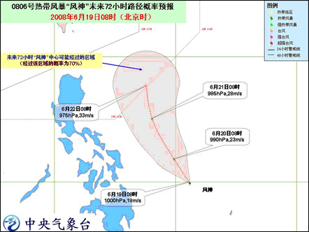 今年第6號熱帶風(fēng)暴“風(fēng)神”(FENGSHEN)今天上午在菲律賓以東洋面生成,上午8時風(fēng)暴中心位于菲律賓馬尼拉東南方向大約1220公里的西北太平洋洋面上,就是北緯9.9度、東經(jīng)131.2度,中心附近最大風(fēng)力有8級(18米/秒)。