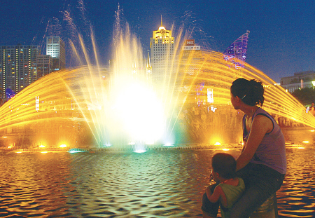 昨晚,市民在流光溢彩的天一廣場(chǎng)噴水池邊納涼。市民切身感受到甬城面貌日新月異,大家的文明素質(zhì)也越來(lái)越高了。(記者周建平攝)