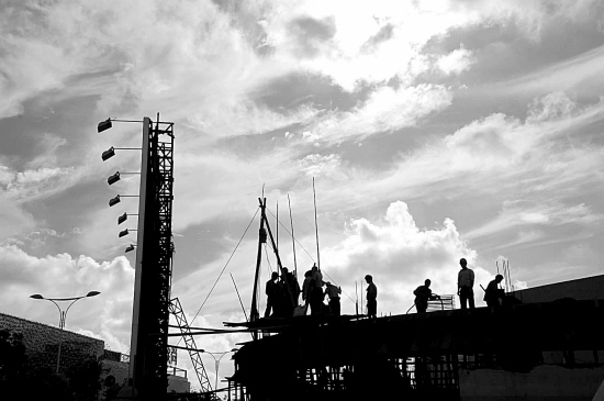昨天,臺(tái)州建筑工地的工人準(zhǔn)備停工避風(fēng)。 陳林聰 攝