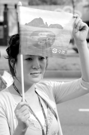 一名韓國婦女手持獨(dú)島旗幟,抗議日本在中學(xué)教科書指導(dǎo)手冊中將該島列為日本領(lǐng)土。