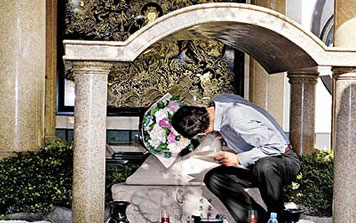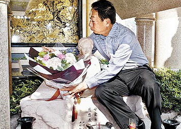 郭臺(tái)銘與林淑如2004年出席兒子郭守正婚禮,最后共同亮相。 中新網(wǎng)7月26日電 臺(tái)灣首富、鴻海集團(tuán)董事長(zhǎng)郭臺(tái)銘今日將與小他24歲的舞蹈老師曾馨瑩結(jié)婚。再婚前夕,郭臺(tái)銘昨日頂著烈陽(yáng),到臺(tái)北縣三峽“愛(ài)物園”家族墓園祭拜亡妻林淑如,他三度深情親吻亡妻雕像,說(shuō):“Serena(林淑如)在我心中永遠(yuǎn)是第一,永遠(yuǎn)活在我心里,雖然現(xiàn)在有人來(lái)接班,但她也永遠(yuǎn)是第二。” 據(jù)臺(tái)灣媒體報(bào)道,郭臺(tái)銘透露,一個(gè)月前他和曾馨瑩去捷克拍婚紗照行前,就已帶曾來(lái)祭拜過(guò)林淑如,他跟曾馨瑩將在蜜月后辦結(jié)婚登記。 57歲的郭臺(tái)銘和林淑如結(jié)婚30年,林淑如一路陪伴他度過(guò)創(chuàng)業(yè)的艱苦歲月,2005年3月12日林淑如因乳癌去世,得年55歲,郭臺(tái)銘傷心欲絕,3年來(lái)他幾乎每個(gè)月都到愛(ài)物園憑吊。去年他公開(kāi)擇偶條件時(shí)表示,曾在亡妻靈前擲筊,“要得到她的允許,我才可以開(kāi)始開(kāi)放我的感情!比蘸笥写_定對(duì)象,也要林淑如同意。 昨天下午4時(shí),身著長(zhǎng)袖襯衫搭配西裝褲的郭臺(tái)銘搭乘奔馳車出現(xiàn),進(jìn)入墓園后,郭臺(tái)銘神情肅穆,開(kāi)始打理祭拜亡妻的儀式。他將一大束鮮花小心翼翼地放在愛(ài)妻雕像邊,并在墓前擺上愛(ài)妻生前愛(ài)吃的四季豆干面和涼拌小黃瓜,一切擺妥,他溫和地請(qǐng)記者退開(kāi)些,讓他有機(jī)會(huì)和愛(ài)妻獨(dú)處。 郭臺(tái)銘在林淑如栩栩如生的雕像旁坐下,對(duì)著雕像額頭深情一吻,手里拿著三張已泛黃的舊照片,邊看邊低聲細(xì)語(yǔ):“Serena,我明天要結(jié)婚了,今天特別來(lái)這里跟你報(bào)備一下……看,這是我們的結(jié)婚照,1975年拍的,你還記得嗎?還有這是我們一起出去玩的照片……你在我心目中永遠(yuǎn)是最重要的,是沒(méi)有人可以取代的,我欠你太多了…希望你可以接受她…”說(shuō)著說(shuō)著,忍不住哽咽,甚至對(duì)著林淑如雕像的唇再長(zhǎng)吻。 郭臺(tái)銘前后對(duì)林淑如的雕像低語(yǔ)了7、8分鐘。隨后提著蛋糕祭拜同葬在墓園的父親和弟弟郭臺(tái)成,同時(shí)再度回到林淑如雕像前說(shuō):“Serena,因?yàn)槟悴缓染疲晕規(guī)畞?lái)敬你……”“Serena,你有沒(méi)有吃(面)……”語(yǔ)畢又吻了第3次,款款深情。 整個(gè)祭拜過(guò)程結(jié)束后,郭臺(tái)銘已是汗流浹背,襯衫全濕透了,他走進(jìn)一旁涼亭內(nèi),接受記者采訪。 大喜前夕,郭臺(tái)銘的心情看得出來(lái)很不錯(cuò),他透露:“在1個(gè)月前我去捷克拍婚紗行前就已經(jīng)帶她(曾馨瑩)來(lái)過(guò),而今天我想是我個(gè)人跟林淑如一個(gè)比較私人的談話,一個(gè)心靈的對(duì)話,所以她不太適合來(lái)。”說(shuō)到這里,他一度哽咽,話都說(shuō)不下,一會(huì)兒才繼續(xù)說(shuō):“Serena(林淑如)在我心中永遠(yuǎn)是第一,永遠(yuǎn)活在我心里,雖然現(xiàn)在有人來(lái)接班,但她也永遠(yuǎn)是第二! 與記者一番暢談后,郭臺(tái)銘在愛(ài)物園整整停留1個(gè)小時(shí),5時(shí)離去。 |