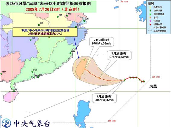 點(diǎn)擊查看其它圖片 中新網(wǎng)7月26日電 中央氣象臺(tái)7月26日10時(shí)發(fā)布臺(tái)風(fēng)消息: 今年第8號(hào)熱帶風(fēng)暴“鳳凰”(FUNG-WONG)今天早晨加強(qiáng)成為強(qiáng)熱帶風(fēng)暴,上午8時(shí)強(qiáng)風(fēng)暴中心位于臺(tái)灣花蓮東偏南方向690公里的洋面上,也就是北緯21.8度,東經(jīng)127.9度,中心附近最大風(fēng)力有10級(jí)(25米/秒)。 預(yù)計(jì),風(fēng)暴中心將以每小時(shí)20公里左右的速度向偏西方向移動(dòng),強(qiáng)度繼續(xù)加強(qiáng),逐漸向臺(tái)灣東部沿海靠近。 受其影響,今天中午到明天中午,臺(tái)灣以東洋面、巴士海峽、巴林塘海峽、臺(tái)灣海峽及臺(tái)灣沿海將有7-10級(jí)大風(fēng),中心經(jīng)過(guò)的附近海面風(fēng)力可達(dá)11-12級(jí)。 |
