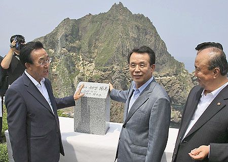 韓國國務總理韓升洙(中)7月29日搭乘直升機,飛往獨島(日本稱竹島)視察,并在寫有“獨島”的石牌前留影,宣示主權。