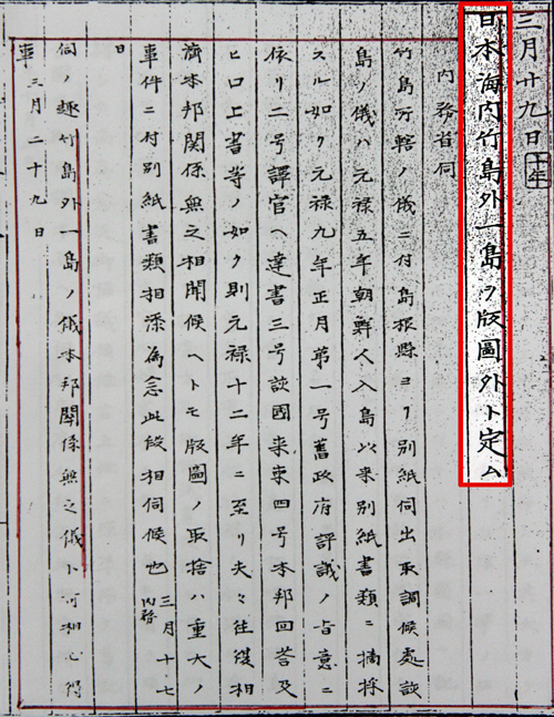 日本提出的游說(shuō)方案指出:1905年2月22日,日本通過(guò)《島根縣公告第40號(hào)》宣布竹島是無(wú)人島,未被他國(guó)占領(lǐng)或支配,因此將其納入日本領(lǐng)土,并劃歸島根縣隱岐島郡管轄,自此竹島即屬日本領(lǐng)土,而《舊金山和約》中也未載明竹島是韓國(guó)領(lǐng)土。