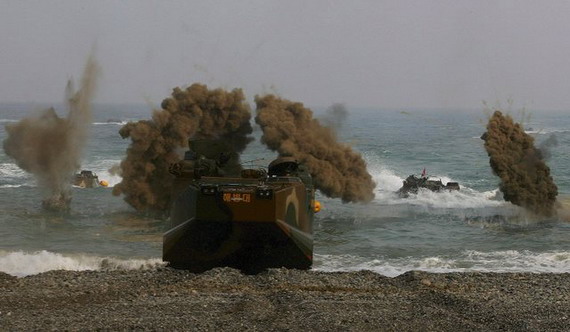 資料圖:韓國(guó)海軍陸戰(zhàn)隊(duì)兩棲戰(zhàn)車(chē)搶灘登陸演練