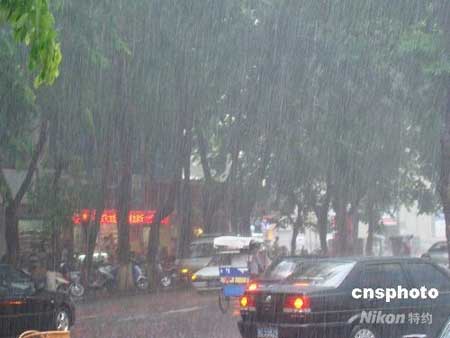 8月6日中午,?谑軣釒эL(fēng)暴“北冕”影響,不時下起瓢潑大雨。據(jù)海南省氣象臺預(yù)報,當(dāng)日白天到夜間,海南島除西部外均將有大到暴雨。圖為公路上的汽車開燈行駛。中新社發(fā) 付美斌 攝