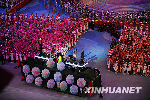 8月24日晚,第29屆夏季奧林匹克運動會閉幕式在北京國家體育場——“鳥巢”舉行。這是歌手在倫敦巴士上進行演唱,貝克漢姆在展示足球。新華社記者郭大岳攝