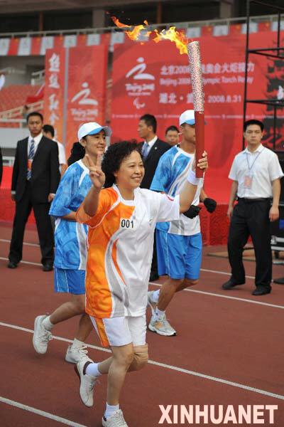 8月31日,第一棒火炬手程瑜手持火炬?zhèn)鬟f。當(dāng)日,北京殘奧會圣火在武漢進行傳遞。 新華社記者郝同前攝