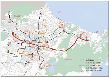 按照國務(wù)院批復(fù)精神,我市軌道交通線網(wǎng)以三江片為核心,以跨三江、連三片、沿三軸為指導(dǎo)思想構(gòu)成了三主三輔六條線、放射狀的軌道交通線網(wǎng),線網(wǎng)全長247.5公里,共設(shè)換乘站19座。規(guī)劃線網(wǎng)在城市周邊留有充分的發(fā)展條件。