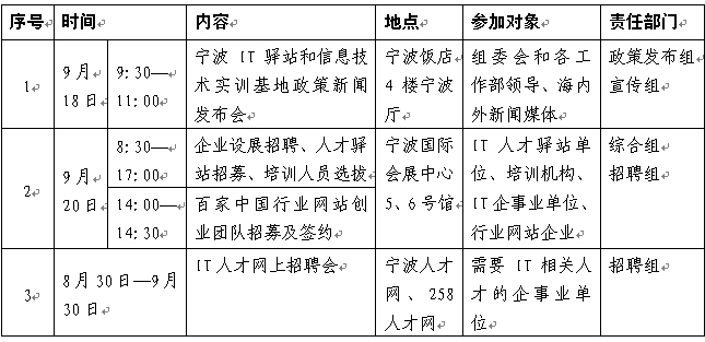 IT服務(wù)外包人才驛站共分四項(xiàng)分體活動(dòng):一是IT服務(wù)外包人才引培現(xiàn)場招募會(huì),組織IT人才驛站單位、培訓(xùn)機(jī)構(gòu)、IT企事業(yè)單位(共30個(gè)標(biāo)準(zhǔn)展位)參會(huì);二是百家中國行業(yè)網(wǎng)站創(chuàng)業(yè)團(tuán)隊(duì)招募及簽約,發(fā)揮寧波集群行業(yè)經(jīng)濟(jì)和中小企業(yè)眾多的優(yōu)勢,利用中搜行業(yè)中國平臺(tái),通過自建行業(yè)供應(yīng)、求購、招商、合作等信息發(fā)布功能較為完備的行業(yè)網(wǎng)站,實(shí)現(xiàn)行業(yè)網(wǎng)站與產(chǎn)業(yè)的有機(jī)結(jié)合。通過行業(yè)域名、辦公用房、中搜行業(yè)中國平臺(tái)、網(wǎng)站推廣及創(chuàng)業(yè)企業(yè)管理服務(wù)等互聯(lián)網(wǎng)創(chuàng)業(yè)的系列套餐,甄選和動(dòng)員已入駐中搜行業(yè)中國平臺(tái)的行業(yè)網(wǎng)站及有意創(chuàng)業(yè)的人才落戶寧波,推進(jìn)百家中國行業(yè)網(wǎng)站企業(yè)落戶寧波工程;三是IT人才網(wǎng)上招聘會(huì),組織市軟件企業(yè)、IT服務(wù)外包企業(yè)、市IT行業(yè)用人單位及需要IT相關(guān)人才的企事業(yè)單位參加;四是IT人才驛站及信息產(chǎn)業(yè)實(shí)訓(xùn)基地政策發(fā)布,主要通過新聞發(fā)布會(huì)、政策匯編分發(fā)、有關(guān)人才招聘網(wǎng)站等途徑集中發(fā)布寧波市IT人才驛站和信息技術(shù)實(shí)訓(xùn)基地等優(yōu)惠政策。