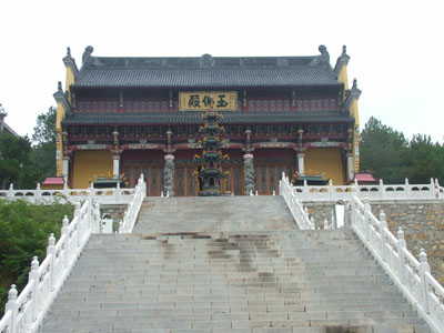 車道右邊是三層11間的賓館,一樓中間是“地藏殿”,九華山大愿地藏王菩薩暫供在這里。賓館左邊是五間廚房,內設齋堂。右邊是“玉佛殿”,內供三尊國內罕見的玉佛,是天津居士出資從緬甸請來的,大殿氣勢雄偉,向下九九八十一層臺階,全是漢白玉欄桿!坝穹鸬睢毙睂γ媸侨A東第一大石佛,高21米,重達千噸,由135件佛體組合而成,名為“阿彌陀佛”。