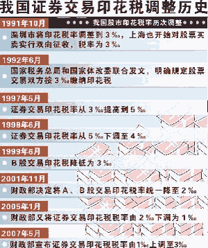圖為2008年以前我國(guó)證券交易印花稅調(diào)整歷史。 新華網(wǎng)北京9月18日電(記者韓潔 羅沙)經(jīng)國(guó)務(wù)院批準(zhǔn),財(cái)政部、國(guó)家稅務(wù)總局決定從2008年9月19日起,調(diào)整證券(股票)交易印花稅征收方式,將現(xiàn)行的對(duì)買賣、繼承、贈(zèng)與所書立的A股、B股股權(quán)轉(zhuǎn)讓書據(jù)按1‰的稅率對(duì)雙方當(dāng)事人征收證券(股票)交易印花稅,調(diào)整為單邊征稅,即對(duì)買賣、繼承、贈(zèng)與所書立的A股、B股股權(quán)轉(zhuǎn)讓書據(jù)的出讓按1‰的稅率征收證券(股票)交易印花稅,對(duì)受讓方不再征稅。 這是繼2008年4月24日下調(diào)證券交易印花稅稅率后,中國(guó)又一次對(duì)該稅率進(jìn)行大的調(diào)整。這也是自1991年以來(lái)中國(guó)股市首次單邊征收證券交易印花稅。 證券交易印花稅是從普通印花稅發(fā)展而來(lái)的,專門針對(duì)股票交易發(fā)生額征收的一種稅。證券交易印花稅是政府調(diào)控股市的重要工具之一。 過(guò)去18年來(lái),中國(guó)股市印花稅稅率曾經(jīng)有過(guò)數(shù)次調(diào)整。 證券交易印花稅自1990年首先在深圳開征,當(dāng)時(shí)主要是為了穩(wěn)定初創(chuàng)的股市及適度調(diào)節(jié)炒股收益,由賣出股票者按成交金額的6‰交納。同年11月份,深圳市對(duì)股票買方也開征6‰的印花稅,內(nèi)地雙邊征收印花稅的歷史開始。 1991年10月,深圳市將印花稅稅率調(diào)整到3‰,上海也開始對(duì)股票買賣實(shí)行雙向征收,稅率為3‰。 1992年6月,國(guó)家稅務(wù)總局和國(guó)家體改委聯(lián)合發(fā)文,明確規(guī)定股票交易雙方按3‰繳納印花稅。 1997年5月,證券交易印花稅稅率從3‰提高到5‰。 1998年6月,證券交易印花稅稅率從5‰下調(diào)至4‰。 1999年6月,B股交易印花稅稅率降低為3‰。 2001年11月,財(cái)政部決定將A、B股交易印花稅稅率統(tǒng)一降至2‰。 2005年1月,財(cái)政部又將證券交易印花稅稅率由2‰下調(diào)為1‰。 2007年5月30日起,財(cái)政部將證券交易印花稅稅率由1‰調(diào)整為3‰。 2008年4月24日起,財(cái)政部將證券交易印花稅稅率由3‰調(diào)整為1‰。 本篇新聞熱門關(guān)鍵詞:收益 交易 |