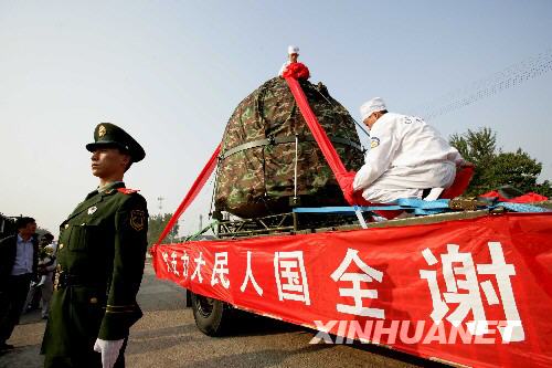 9月30日,神舟七號飛船返回艙運抵北京昌平火車站,主著陸場正式向飛船研制單位中國空間技術研究院交接返回艙。這是返回艙被吊裝到汽車上,準備運回北京航天城的廠房內。 新華社記者 查春明 攝