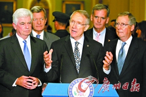 美國國會(huì)參議院多數(shù)黨領(lǐng)袖里德(前中)、參議院少數(shù)黨領(lǐng)袖麥康奈爾(前右)、參議院銀行、住房和城市事務(wù)委員會(huì)主席克里斯托弗·多德(前左)在對(duì)修改后的金融救援計(jì)劃投票后出席新聞發(fā)布會(huì)。 新華社發(fā)