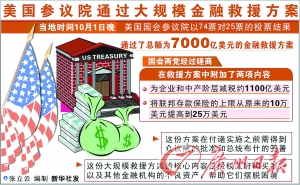 美國國會(huì)參議院當(dāng)?shù)貢r(shí)間1日晚(北京時(shí)間10月2日上午)投票表決通過了數(shù)千億美元的金融救援計(jì)劃。眾議院定于3日投票表決。能否使眾議院最終通過該方案,是布什政府和國會(huì)兩黨領(lǐng)袖目前面臨的最大挑戰(zhàn)。