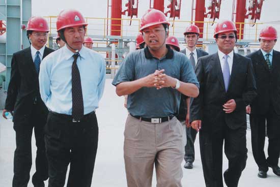 2005年6月8日,時任中信集團公司總經(jīng)理、現(xiàn)任董事長孔丹(左二),中信集團公司副總經(jīng)理王炯(右二)考察寧波萬華工業(yè)園。