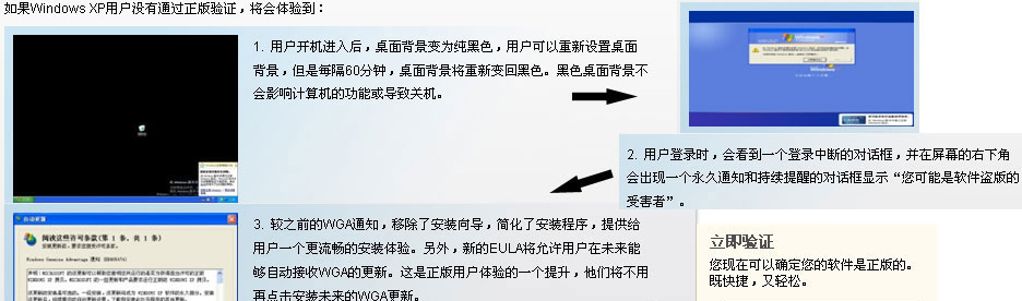 ——Windows正版增值計劃通知(簡稱WGA)和Office正版增值計劃通知(簡稱OGA)。屆時,盜版XP專業(yè)版用戶的桌面背景每隔1小時將被成純黑色,盜版Office用戶軟件上將被永久添加視覺標記。國內用戶對微軟“黑屏”的做法反應劇烈。