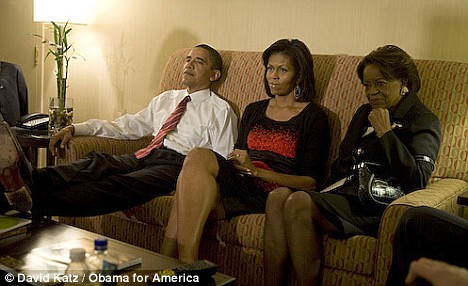 休息時間:可能奧巴正在為提名演講積蓄能量,他頭向后傾,雙腳伸到桌上,他的妻子米歇爾陪伴在身旁。 |