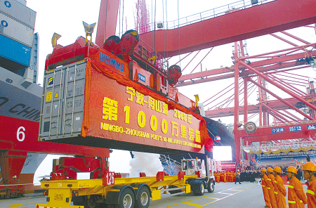 目前,全世界年吞吐量超過(guò)千萬(wàn)標(biāo)箱的港口為數(shù)不多,國(guó)內(nèi)只有3個(gè)。這意味著,寧波—舟山港成為國(guó)內(nèi)第4個(gè)千萬(wàn)等級(jí)的世界大港,有望躋身世界前十強(qiáng)。