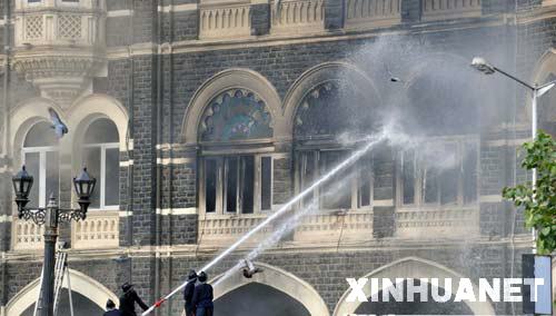 圖為消防人員在孟買泰姬瑪哈酒店外滅火 2008年11月29日 印度軍方宣布在孟買泰姬瑪哈酒店的清剿行動(dòng)已經(jīng)結(jié)束 新華社 王曄攝
