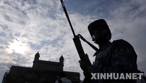 一名印度快速反應(yīng)部隊(duì)人員在孟買泰姬瑪哈酒店前戒備 2008年11月29日 印度軍方宣布在孟買泰姬瑪哈酒店的清剿行動(dòng)已經(jīng)結(jié)束 新華社 王曄攝