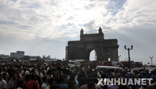 記者們?cè)诿腺I泰姬瑪哈酒店前的印度門前采訪 2008年11月29日 印度軍方宣布在孟買泰姬瑪哈酒店的清剿行動(dòng)已經(jīng)結(jié)束 新華社 王曄攝