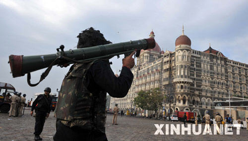 一名印度特種部隊(duì)人員在孟買泰姬瑪哈酒店前戒備 2008年11月29日 印度軍方宣布在孟買泰姬瑪哈酒店的清剿行動(dòng)已經(jīng)結(jié)束 新華社 王曄攝