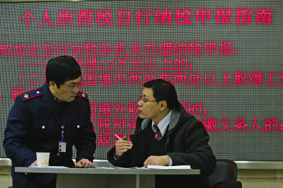 稅務工作人員指導納稅人填寫申報資料記者 陳誠 攝