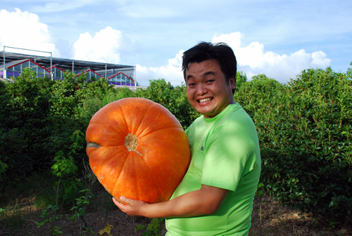 圖片說明:懷抱碩大的南瓜,采訪團(tuán)的記者驚喜不已。