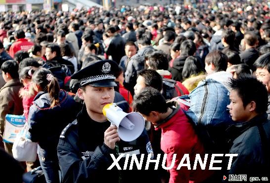資料圖片:2008年2月13日,一名鐵路民警在安徽淮北火車站維持秩序。新華社發(fā)