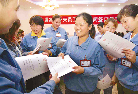 浙江廣博集團(tuán)有限公司外來(lái)員工在簽訂勞動(dòng)合同時(shí),高興得合不攏嘴——企業(yè)已把外來(lái)員工免費(fèi)享受五大保險(xiǎn)的內(nèi)容寫(xiě)進(jìn)了合同。(胡建華 攝)