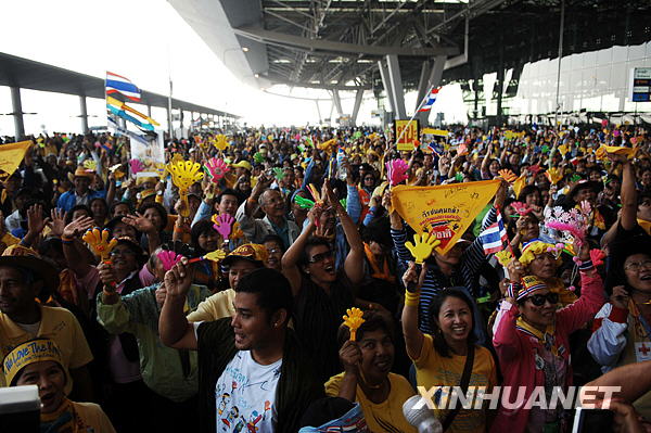 12月3日,泰國(guó)反政府的人民民主聯(lián)盟(民盟)支持者在曼谷素萬(wàn)那普國(guó)際機(jī)場(chǎng)載歌載舞。當(dāng)天,民盟結(jié)束對(duì)總理府和曼谷兩座機(jī)場(chǎng)的占領(lǐng),宣稱推翻頌猜政府的目的已經(jīng)達(dá)到,所有反政府集會(huì)全部停止。新華社記者凌朔攝