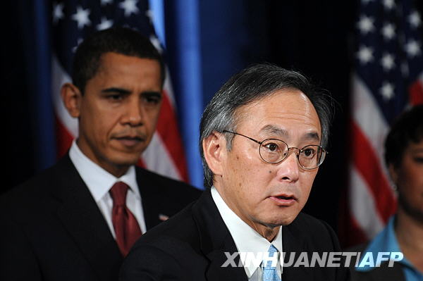 12月15日,被提名為新一任能源部長的華裔科學(xué)家、諾貝爾物理學(xué)獎得主朱棣文(右)在芝加哥舉行的新聞發(fā)布會上發(fā)表講話。新華社/法新