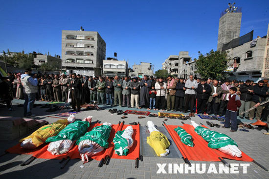 1月9日,在加沙地帶北部,人們?yōu)樗烙谝陨羞M(jìn)攻的七名巴勒斯坦人舉行葬禮,這七人來自同一個(gè)家庭。新華社發(fā)(納賽爾攝)