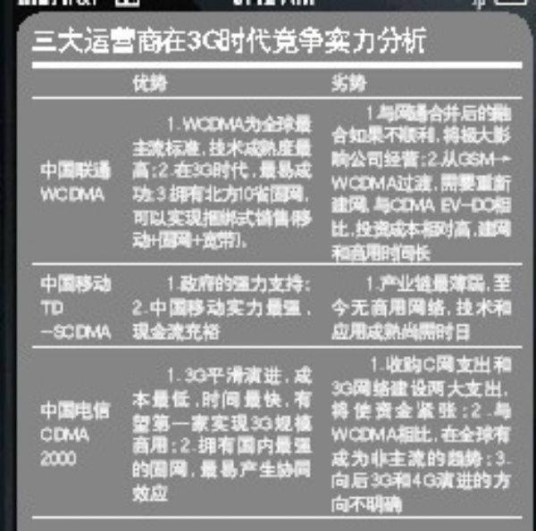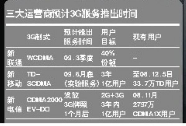 對(duì)于運(yùn)營(yíng)商來(lái)說,3G牌照發(fā)放意味著新一輪角逐序曲開場(chǎng);對(duì)于設(shè)備商來(lái)說,三年逾3000億投資意味著大蛋糕、大爭(zhēng)奪;而對(duì)于用戶來(lái)說,3G意味著手機(jī)上網(wǎng)帶寬飆升,資費(fèi)越降越低———“3G就是出租車?yán)锏囊曨l會(huì)議;3G就是你坐火車也不會(huì)錯(cuò)過的肥皂;3G就是從現(xiàn)場(chǎng)發(fā)回總部供分析用的圖像;3G就是與你的朋友共享你在摩洛哥的美妙假期!