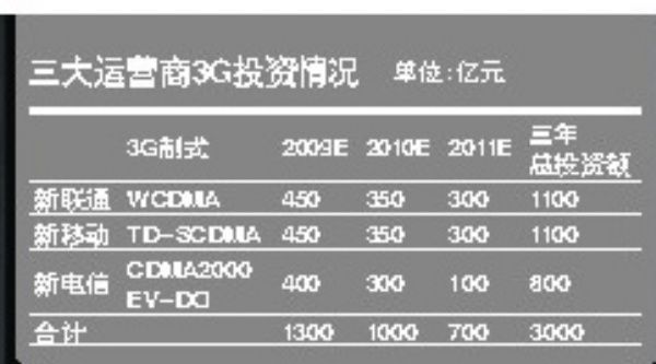 “運(yùn)營(yíng)商的重點(diǎn)將轉(zhuǎn)到全力以赴建設(shè)3G網(wǎng)絡(luò)上,而運(yùn)營(yíng)商未來(lái)5-10年的優(yōu)劣,將取決于3G時(shí)代的競(jìng)爭(zhēng)實(shí)力。因此此次建網(wǎng)策略,運(yùn)營(yíng)商很可能以時(shí)間短、質(zhì)量高為目標(biāo),絕不會(huì)拖拖拉拉,而是追求速成!敝行沤ㄍ额A(yù)測(cè),中國(guó)聯(lián)通、中國(guó)移動(dòng)和中國(guó)電信今后三年的3G投資分別為1300億元、1000億元和700億元,總投資額達(dá)3000億元。