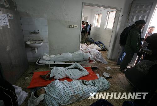 1月16日,在以色列軍事行動(dòng)中被打死的巴勒斯坦人的尸體停放在加沙城一座停尸房?jī)?nèi)。巴勒斯坦急救部門加沙地帶負(fù)責(zé)人當(dāng)日說(shuō),隨著以軍對(duì)加沙地帶的軍事打擊進(jìn)入第21天,加沙地帶的死亡人數(shù)已超過(guò)1133人,另有至少5150人受傷。新華社記者納賽爾攝