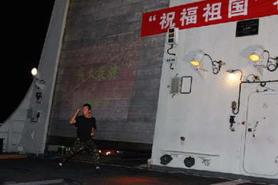 中國(guó)傳統(tǒng)的除夕前夜,“海口”艦艉甲板上燈火通明、人頭攢動(dòng),甲板一側(cè)高高懸起一條“‘祝福祖國(guó)’春節(jié)聯(lián)歡晚會(huì)”的橫幅。當(dāng)?shù)貢r(shí)間二十四日晚上八時(shí)(北京時(shí)間二十五日凌晨一時(shí))許,隨著歡快樂(lè)曲的響起,伴著拂面的習(xí)習(xí)海風(fēng),一場(chǎng)別開(kāi)生面的甲板“春晚”正式拉開(kāi)大幕。