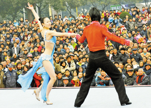 昨天下午,2009年春節(jié)文化活動《新春大舞臺》在中山廣場拉開序幕。圖為飛越時空甜心組合正在表演。記者 王增芳 攝