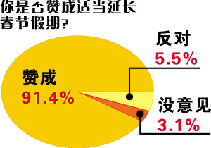 春節(jié)七天假期“走人戶”都不夠用,根本沒多少時間休息——本報昨日報道引起讀者共鳴,絕大多數(shù)讀者認(rèn)為春節(jié)假期太短。短短一天,騰訊網(wǎng)關(guān)于本報稿件的評論,就有兩萬多條。搜狐網(wǎng)發(fā)起的投票顯示,8萬多人中超過九成人認(rèn)為春節(jié)七天太短,支持延長春節(jié)。全國人大代表王曉琳在接受記者采訪時表示,將把市民的意見帶到全國兩會。