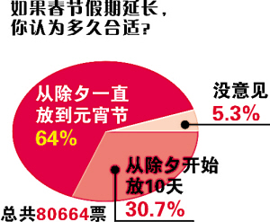 記者看到,多數(shù)讀者支持將假期延長到元宵節(jié),既緩解春運(yùn)壓力,又給上班族一個緩沖期。一位讀者說,整個春節(jié)七天天天跑東跑西到處拜年,到了上班時間根本就提不起精神。他認(rèn)為,放假到元宵比較合適,因?yàn)橐荒晗聛黼y得有好好休息的機(jī)會,也可以讓親戚朋友多幾天時間團(tuán)聚。
